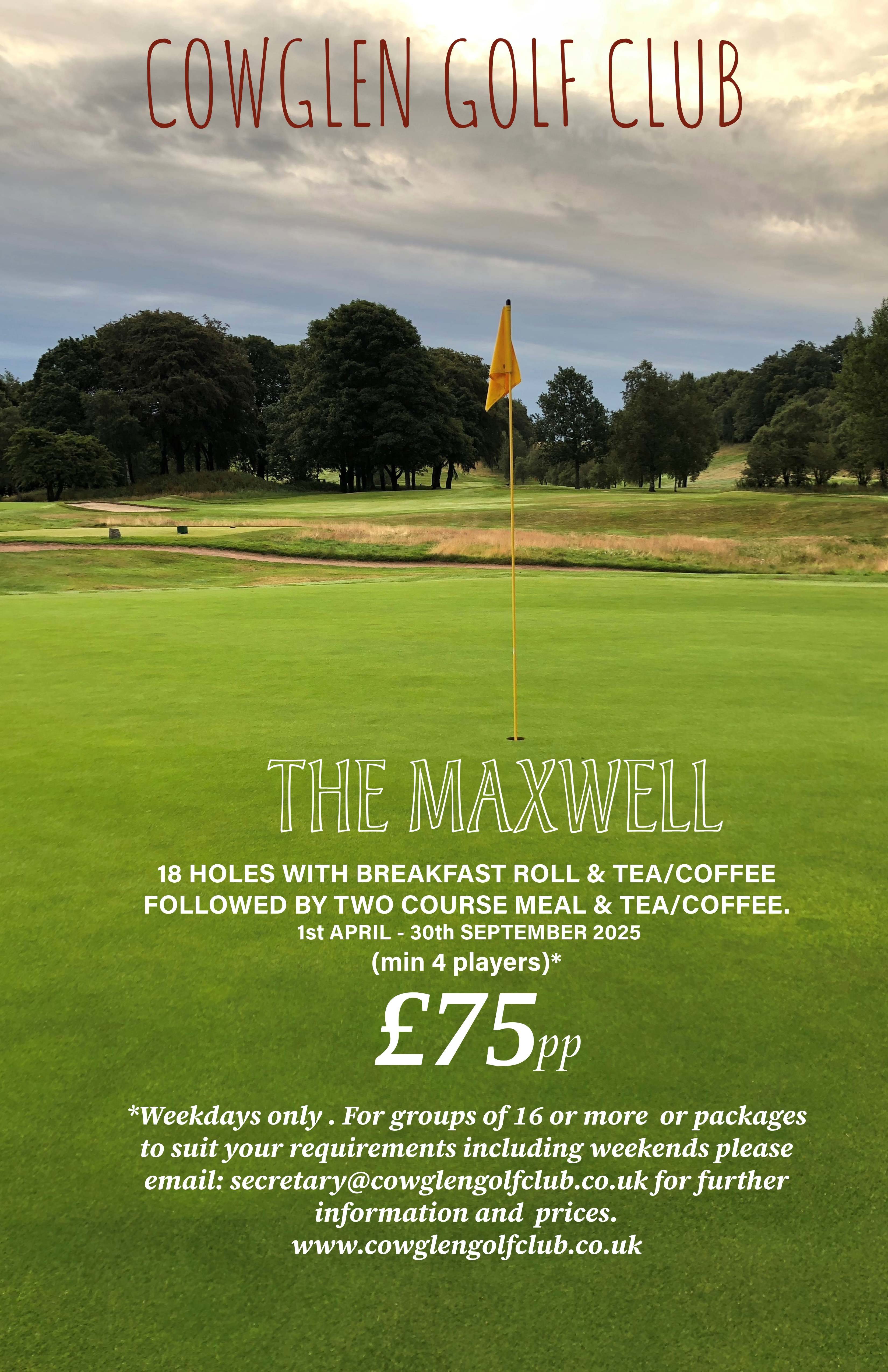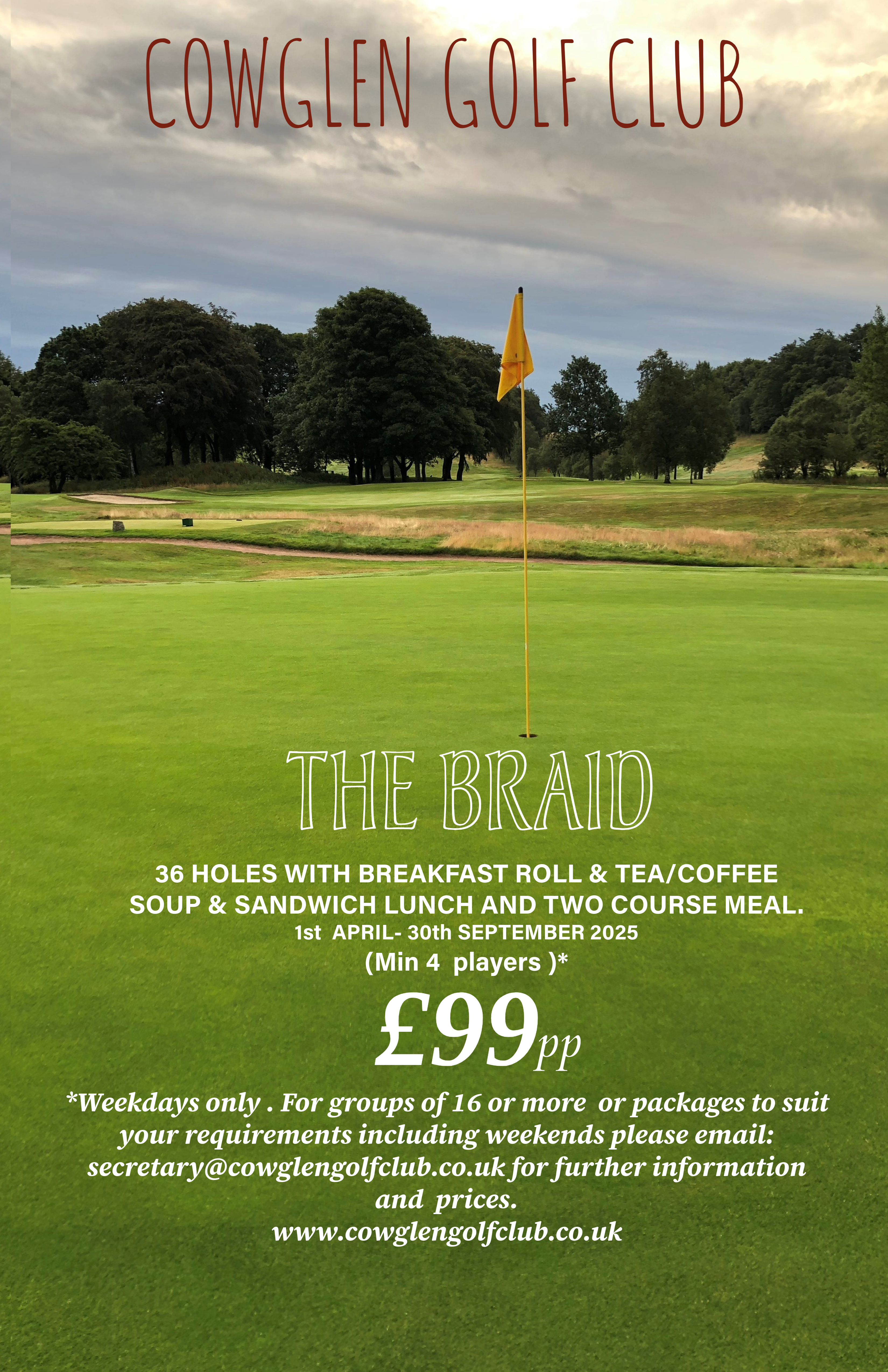 * Weekdays only. For groups of 16 or more or packages to suit your requirements please email secretary@cowglengolfclub.co.uk or complete the visitor form for further information and prices.